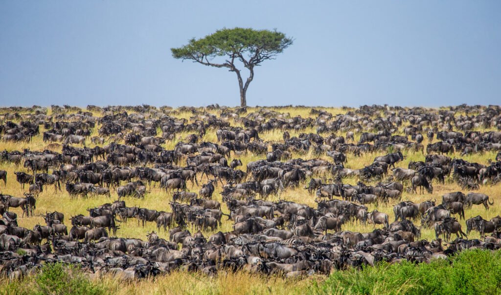 A massive herd of wildebeest moves across the golden Serengeti plains, framed by a solitary acacia tree that defines the classic African savannah.